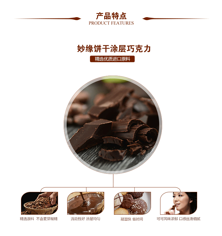 妙緣餅干涂層巧克力磚,精選優質進口可可豆為原料,經過特殊配方與工藝調制,流動性好,涂層均勻,常溫下凝固快,省時間易于操作,口感絲滑細膩。可用于巧克力餅干涂層、夾心,膨化食品涂層,西點慕斯漿料、淋面裝飾等。