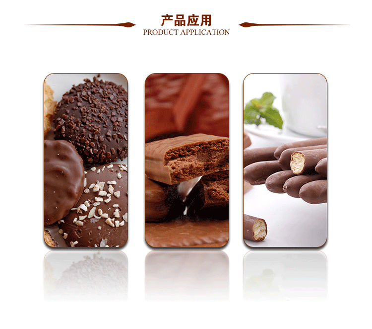 產品使用:可用于巧克力餅干涂層、夾心,膨化食品涂層,西點慕斯漿料、淋面裝飾等