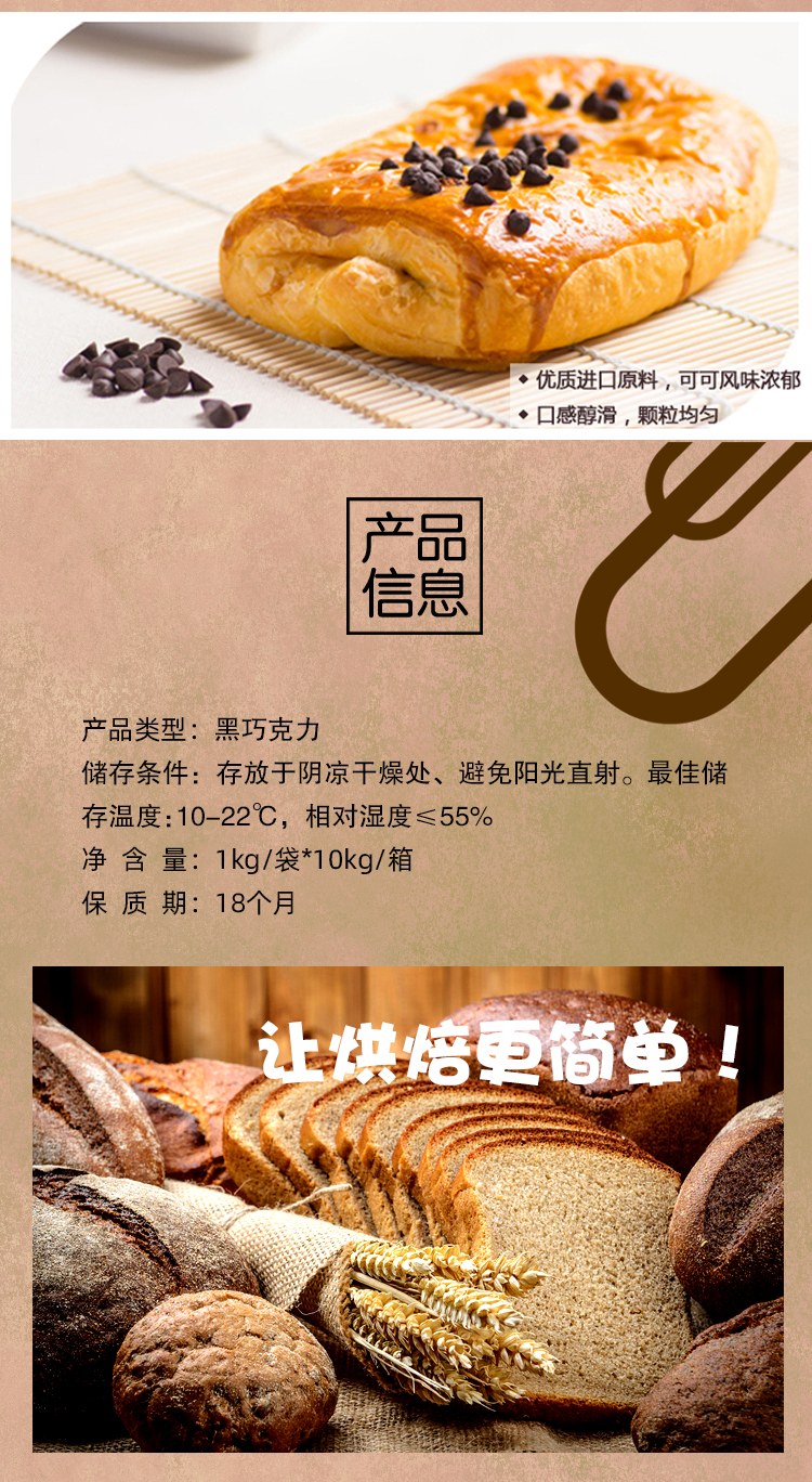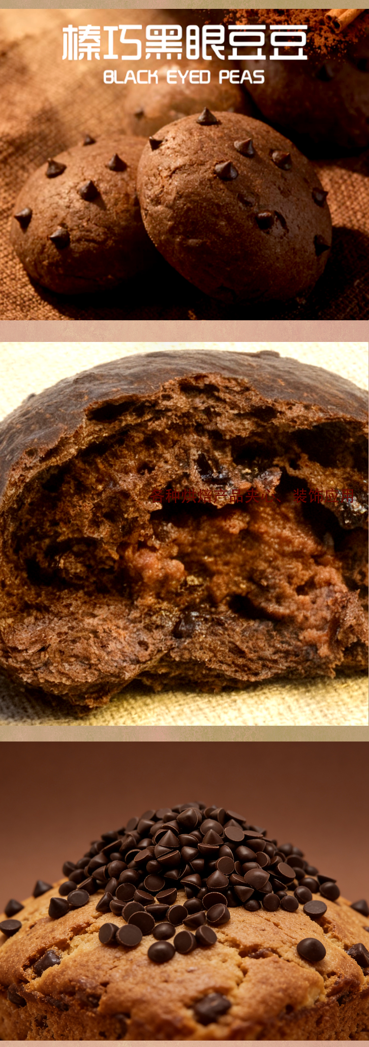 用法:烤蛋糕或者曲奇餅干時撒點耐焙烤醇黑巧克力豆在表面上再放烤箱,出爐后就可以吃到脆脆的巧克力豆蛋糕或者說巧克力豆餅干了,記得是撒點在表面上巧克力才不會融,如果拌在里面也很好吃,只是巧克力可能會融化在里面。