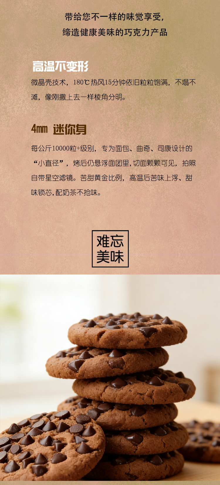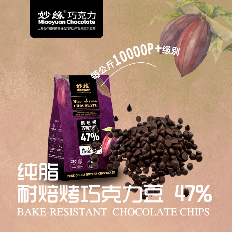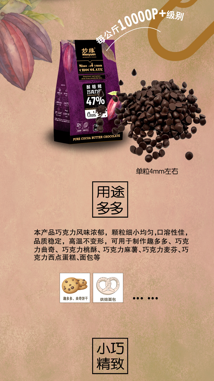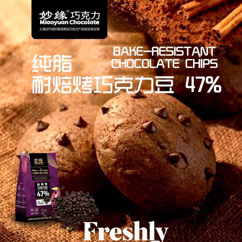 妙緣耐焙烤醇黑巧克力豆,可愛小水滴狀純脂巧克力豆,可可含量達46%以上,口感醇滑,入口即化;顆粒均勻,可達30000粒/kg;由于特別的配方調制,顛覆純脂巧克力熔點低易融化的特性,品質穩定,能夠耐高溫烘焙不變形,味道也和烘焙前一致!。妙緣耐焙烤醇黑巧克力豆適合制作曲奇餅干類、重磅蛋糕、面包吐司,冰淇淋、夾心、預混料等,或者加入少許至撻派餡料增添產品特色及風味!