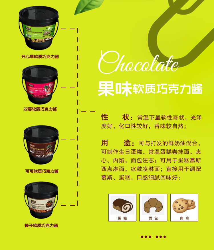產(chǎn)品口味:開心果軟質(zhì)巧克力醬/雙莓軟質(zhì)巧克力醬/榴蓮芝士軟質(zhì)巧克力醬/可可軟質(zhì)巧克力醬/榛子軟質(zhì)巧克力醬